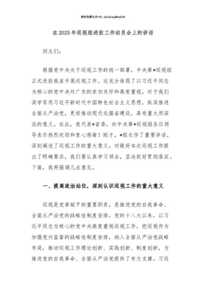 【七哥公文】2025年:【七哥公文】在2025年巡视组进驻工作动员会上的讲话+更多免费公文+VX:QiGeGongWen2024+更多免费公文+VX:QiGeGongWen2024