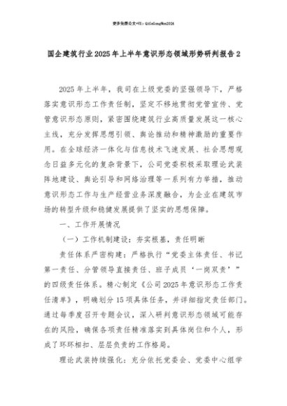【七哥公文】2025年:【七哥公文】国企建筑行业2025年上半年意识形态领域形势研判报告2+更多免费公文+VX:QiGeGongWen2024+更多免费公文+VX:QiGeGongWen2024