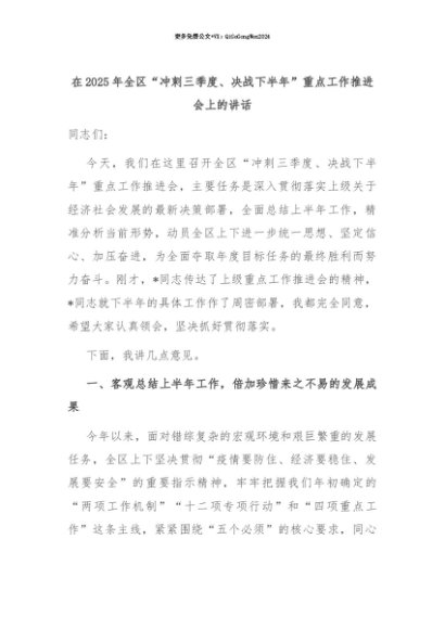 【七哥公文】2025年:【七哥公文】在2025年全区“冲刺三季度、决战下半年”重点工作推进会上的讲话+更多免费公文+VX:QiGeGongWen2024+更多免费公文+VX:QiGeGongWen2024