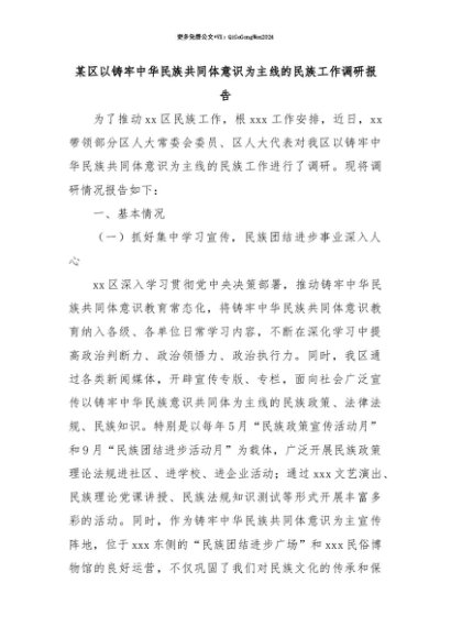 【七哥公文】2025年:【七哥公文】某区以铸牢中华民族共同体意识为主线的民族工作调研报告+更多免费公文+VX:QiGeGongWen2024+更多免费公文+VX:QiGeGongWen2024