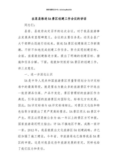 【七哥公文】2025年:【七哥公文】在某县推进5A景区创建工作会议的讲话+更多免费公文+VX:QiGeGongWen2024+更多免费公文+VX:QiGeGongWen2024