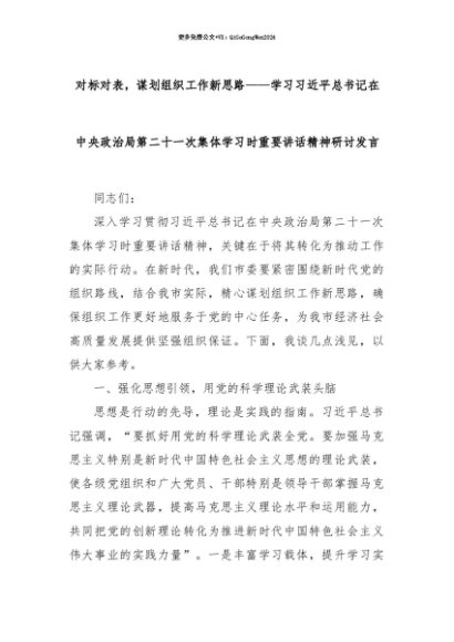 【七哥公文】2025年:【七哥公文】对标对表,谋划组织工作新思路——学习习近平总书记在中央政治局第二十一次集体学习时重要讲话精神研讨发言+更多免费公文+VX:QiGeGongWen2024+更多免费公文+VX:QiGeGongWen2024