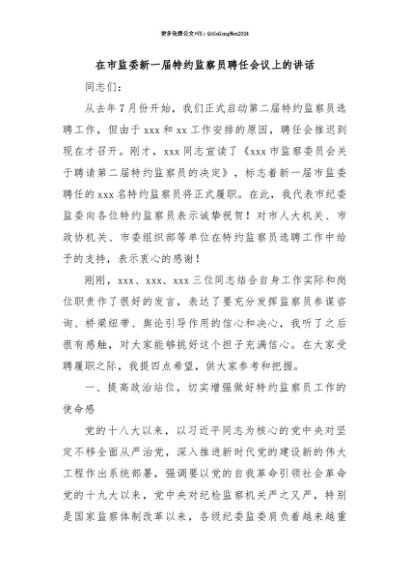 【七哥公文】2025年:【七哥公文】在市监委新一届特约监察员聘任会议上的讲话+更多免费公文+VX:QiGeGongWen2024+更多免费公文+VX:QiGeGongWen2024