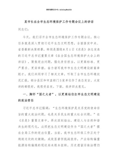 【七哥公文】2025年:【七哥公文】某市长在全市生态环境保护工作专题会议上的讲话+更多免费公文+VX:QiGeGongWen2024+更多免费公文+VX:QiGeGongWen2024
