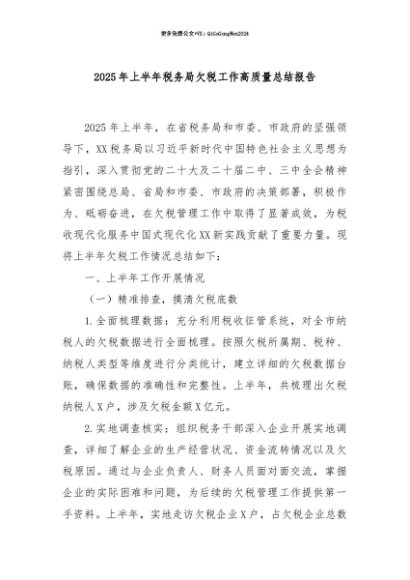 【七哥公文】2025年:【七哥公文】2025年上半年税务局欠税工作高质量总结报告+更多免费公文+VX:QiGeGongWen2024+更多免费公文+VX:QiGeGongWen2024