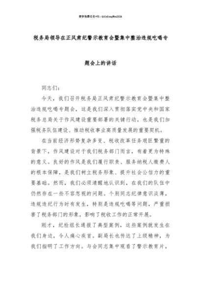 【七哥公文】2025年:【七哥公文】税务局领导在正风肃纪警示教育会暨集中整治违规吃喝专题会上的讲话+更多免费公文+VX:QiGeGongWen2024+更多免费公文+VX:QiGeGongWen2024