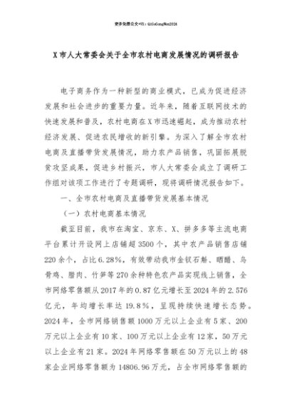 【七哥公文】2025年:【七哥公文】X市人大常委会关于全市农村电商发展情况的调研报告+更多免费公文+VX:QiGeGongWen2024+更多免费公文+VX:QiGeGongWen2024