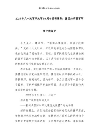 【七哥公文】2025年:【七哥公文】2025年八一建军节建军98周年党课课件:强国必须强军军强才能国安+更多免费公文+VX:QiGeGongWen2024+更多免费公文+VX:QiGeGongWen2024