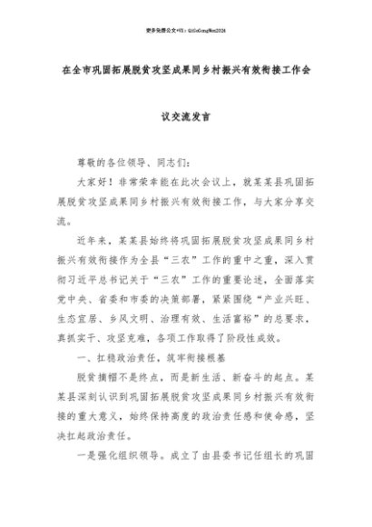 【七哥公文】2025年:【七哥公文】在全市巩固拓展脱贫攻坚成果同乡村振兴有效衔接工作会议交流发言+更多免费公文+VX:QiGeGongWen2024+更多免费公文+VX:QiGeGongWen2024