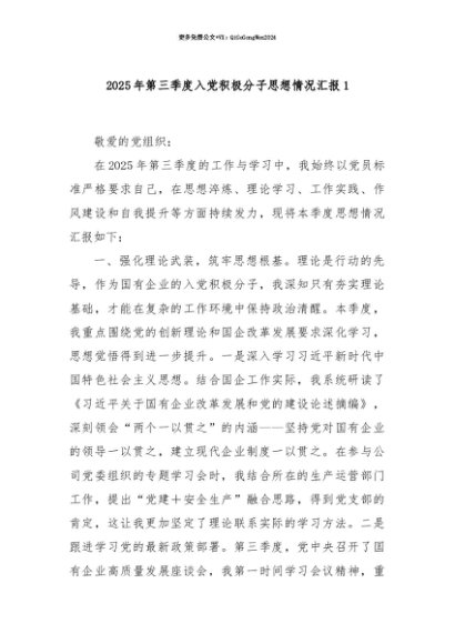 【七哥公文】2025年:【七哥公文】2025年第三季度入党积极分子思想情况汇报1+更多免费公文+VX:QiGeGongWen2024+更多免费公文+VX:QiGeGongWen2024