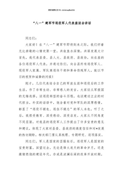 【七哥公文】2025年:【七哥公文】“八一”建军节退役军人代表座谈会讲话+更多免费公文+VX:QiGeGongWen2024+更多免费公文+VX:QiGeGongWen2024