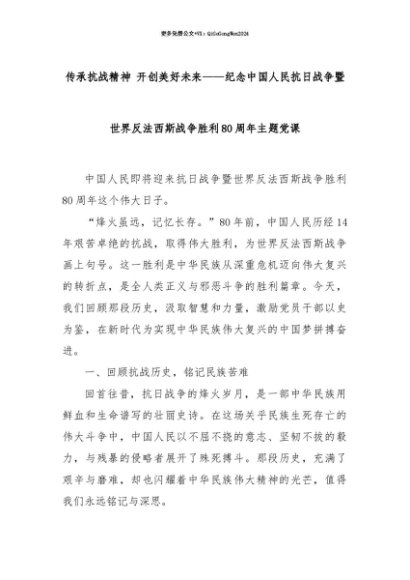 【七哥公文】2025年:【七哥公文】传承抗战精神 开创美好未来——纪念中国人民抗日战争暨世界反法西斯战争胜利80周年主题党课+更多免费公文+VX:QiGeGongWen2024+更多免费公文+VX:QiGeGongWen2024