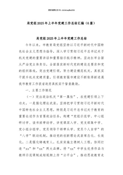 【七哥公文】2025年:【七哥公文】(6篇)局党组2025年上半年党建工作总结汇编+更多免费公文+VX:QiGeGongWen2024+更多免费公文+VX:QiGeGongWen2024
