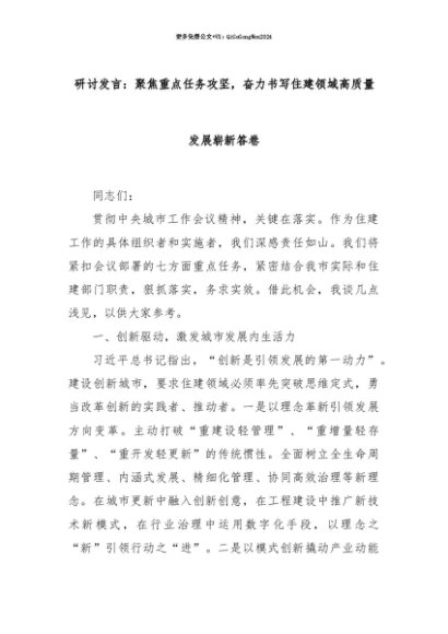 【七哥公文】2025年:【七哥公文】研讨发言:聚焦重点任务攻坚,奋力书写住建领域高质量发展崭新答卷+更多免费公文+VX:QiGeGongWen2024+更多免费公文+VX:QiGeGongWen2024
