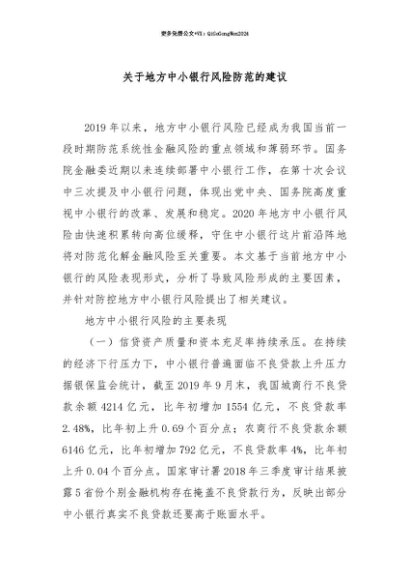【七哥公文】2025年:【七哥公文】关于地方中小银行风险防范的建议+更多免费公文+VX:QiGeGongWen2024+更多免费公文+VX:QiGeGongWen2024
