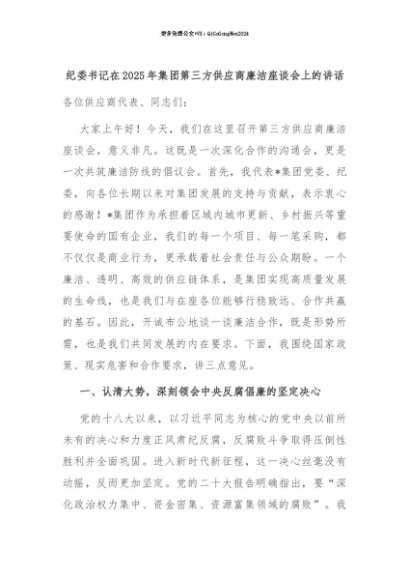 【七哥公文】2025年:【七哥公文】纪委书记在2025年集团第三方供应商廉洁座谈会上的讲话+更多免费公文+VX:QiGeGongWen2024+更多免费公文+VX:QiGeGongWen2024