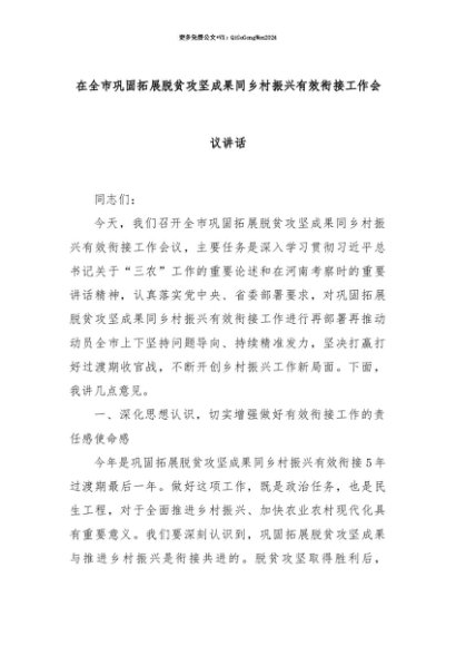 【七哥公文】2025年:【七哥公文】在全市巩固拓展脱贫攻坚成果同乡村振兴有效衔接工作会议讲话+更多免费公文+VX:QiGeGongWen2024+更多免费公文+VX:QiGeGongWen2024