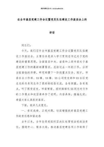 【七哥公文】2025年:【七哥公文】在全市基层党建工作会议暨党员队伍建设工作座谈会上的讲话+更多免费公文+VX:QiGeGongWen2024+更多免费公文+VX:QiGeGongWen2024