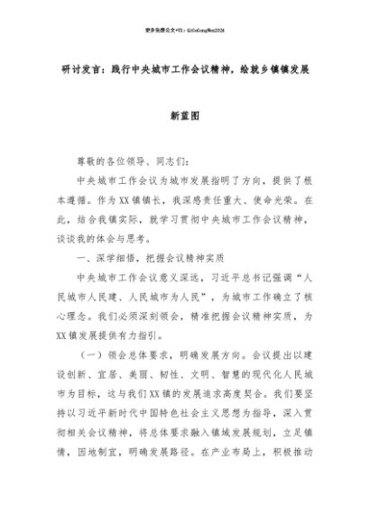 【七哥公文】2025年:【七哥公文】研讨发言:践行中央城市工作会议精神,绘就乡镇镇发展新蓝图+更多免费公文+VX:QiGeGongWen2024+更多免费公文+VX:QiGeGongWen2024