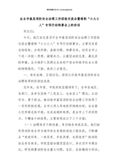 【七哥公文】2025年:【七哥公文】在全市基层消防安全治理工作经验交流会暨遏制“小火亡人”专项行动部署会上的讲话+更多免费公文+VX:QiGeGongWen2024+更多免费公文+VX:QiGeGongWen2024