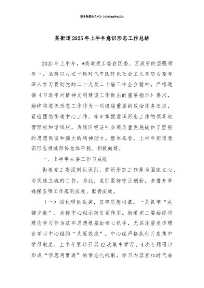 【七哥公文】2025年:【七哥公文】某街道2025年上半年意识形态工作总结+更多免费公文+VX:QiGeGongWen2024+更多免费公文+VX:QiGeGongWen2024