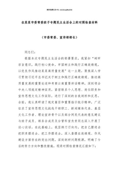 【七哥公文】2025年:【七哥公文】在某某市委常委班子专题民主生活会上的对照检查材料(市委常委、宣传部部长)+更多免费公文+VX:QiGeGongWen2024+更多免费公文+VX:QiGeGongWen2024