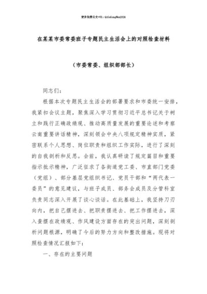 【七哥公文】2025年:【七哥公文】在某某市委常委班子专题民主生活会上的对照检查材料(市委常委、组织部部长)+更多免费公文+VX:QiGeGongWen2024+更多免费公文+VX:QiGeGongWen2024