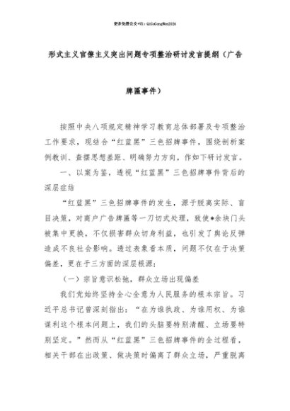 【七哥公文】2025年:【七哥公文】形式主义官僚主义突出问题专项整治研讨发言提纲(广告牌匾事件)+更多免费公文+VX:QiGeGongWen2024+更多免费公文+VX:QiGeGongWen2024