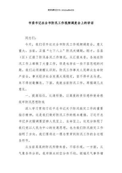 【七哥公文】2025年:【七哥公文】市委书记在全市防汛工作视频调度会上的讲话+更多免费公文+VX:QiGeGongWen2024+更多免费公文+VX:QiGeGongWen2024