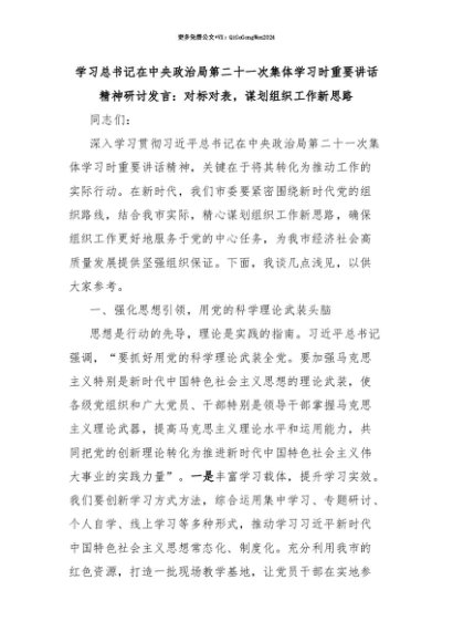 【七哥公文】2025年:【七哥公文】学习总书记在中央政治局第二十一次集体学习时重要讲话精神研讨发言:对标对表,谋划组织工作新思路+更多免费公文+VX:QiGeGongWen2024+更多免费公文+VX:QiGeGongWen2024