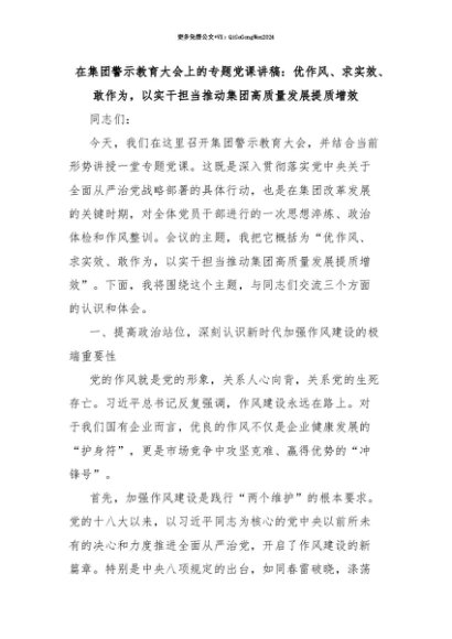 【七哥公文】2025年:【七哥公文】在集团警示教育大会上的专题党课讲稿:优作风、求实效、敢作为,以实干担当推动集团高质量发展提质增效+更多免费公文+VX:QiGeGongWen2024+更多免费公文+VX:QiGeGongWen2024