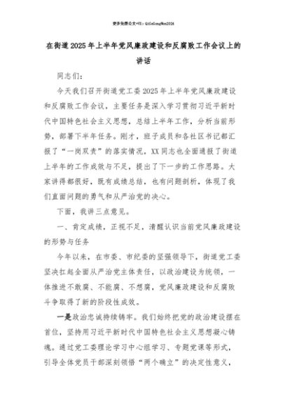 【七哥公文】2025年:【七哥公文】在街道2025年上半年党风廉政建设和反腐败工作会议上的讲话+更多免费公文+VX:QiGeGongWen2024+更多免费公文+VX:QiGeGongWen2024