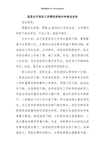 【七哥公文】2025年:【七哥公文】某县关于信访工作滞后的检讨和表态发言+更多免费公文+VX:QiGeGongWen2024+更多免费公文+VX:QiGeGongWen2024