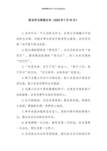 【七哥公文】2025年:【七哥公文】担当作为类排比句(2025年7月30日)+更多免费公文+VX:QiGeGongWen2024+更多免费公文+VX:QiGeGongWen2024