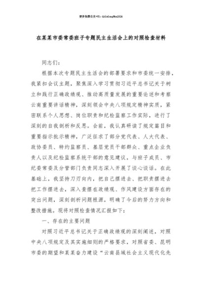 【七哥公文】2025年:【七哥公文】在某某市委常委班子专题民主生活会上的对照检查材料+更多免费公文+VX:QiGeGongWen2024+更多免费公文+VX:QiGeGongWen2024
