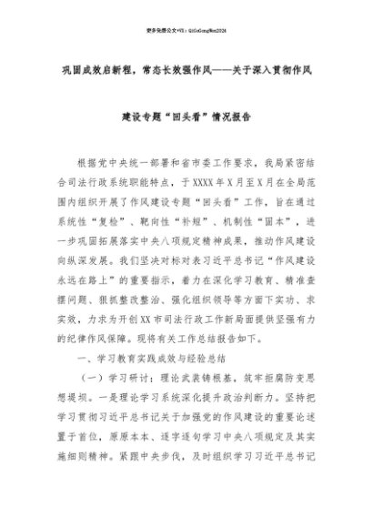 【七哥公文】2025年:【七哥公文】巩固成效启新程,常态长效强作风——关于深入贯彻作风建设专题“回头看”情况报告+更多免费公文+VX:QiGeGongWen2024+更多免费公文+VX:QiGeGongWen2024