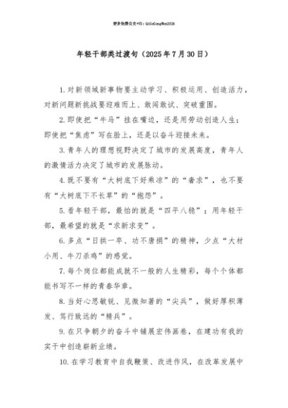 【七哥公文】2025年:【七哥公文】年轻干部类过渡句(2025年7月30日)+更多免费公文+VX:QiGeGongWen2024+更多免费公文+VX:QiGeGongWen2024