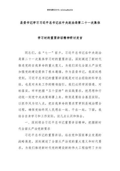 【七哥公文】2025年:【七哥公文】县委书记学习总书记在中央政治局第二十一次集体学习时的重要讲话精神研讨发言+更多免费公文+VX:QiGeGongWen2024+更多免费公文+VX:QiGeGongWen2024