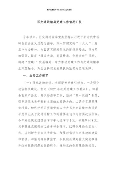 【七哥公文】2025年:【七哥公文】区交通运输局党建工作情况汇报+更多免费公文+VX:QiGeGongWen2024+更多免费公文+VX:QiGeGongWen2024