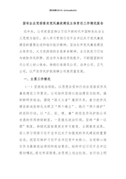 【七哥公文】2025年:【七哥公文】国有企业党委落实党风廉政建设主体责任工作情况报告+更多免费公文+VX:QiGeGongWen2024+更多免费公文+VX:QiGeGongWen2024