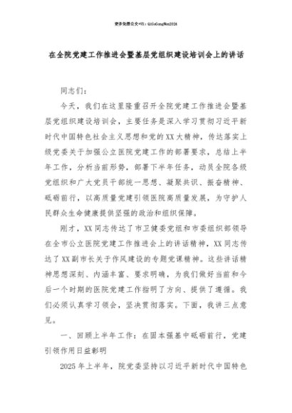 【七哥公文】2025年:【七哥公文】在全院党建工作推进会暨基层党组织建设培训会上的讲话+更多免费公文+VX:QiGeGongWen2024+更多免费公文+VX:QiGeGongWen2024