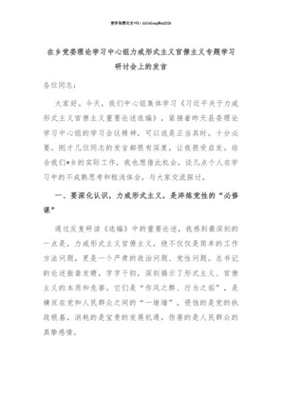 【七哥公文】2025年:【七哥公文】在乡党委理论学习中心组力戒形式主义官僚主义专题学习研讨会上的发言+更多免费公文+VX:QiGeGongWen2024+更多免费公文+VX:QiGeGongWen2024