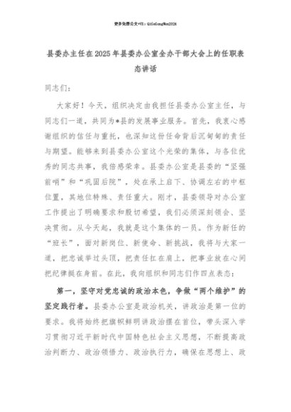 【七哥公文】2025年:【七哥公文】县委办主任在2025年县委办公室全办干部大会上的任职表态讲话+更多免费公文+VX:QiGeGongWen2024+更多免费公文+VX:QiGeGongWen2024