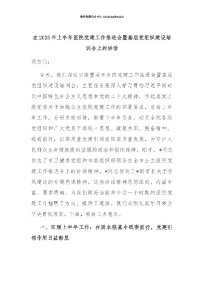 【七哥公文】2025年:【七哥公文】在2025年上半年医院党建工作推进会暨基层党组织建设培训会上的讲话+更多免费公文+VX:QiGeGongWen2024+更多免费公文+VX:QiGeGongWen2024