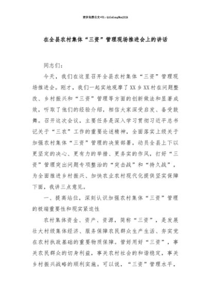 【七哥公文】2025年:【七哥公文】在全县农村集体“三资”管理现场推进会上的讲话+更多免费公文+VX:QiGeGongWen2024+更多免费公文+VX:QiGeGongWen2024