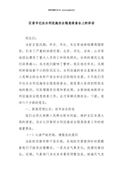 【七哥公文】2025年:【七哥公文】区委书记在水利设施安全隐患排查会上的讲话+更多免费公文+VX:QiGeGongWen2024+更多免费公文+VX:QiGeGongWen2024