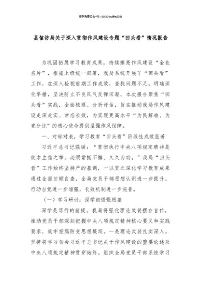 【七哥公文】2025年:【七哥公文】县信访局关于深入贯彻作风建设专题“回头看”情况报告+更多免费公文+VX:QiGeGongWen2024+更多免费公文+VX:QiGeGongWen2024