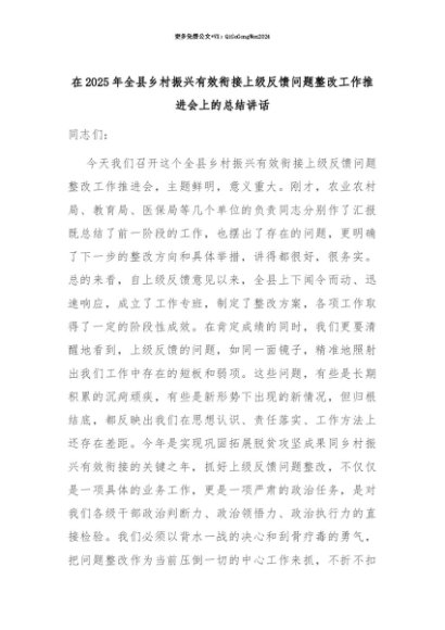 【七哥公文】2025年:【七哥公文】在2025年全县乡村振兴有效衔接上级反馈问题整改工作推进会上的总结讲话+更多免费公文+VX:QiGeGongWen2024+更多免费公文+VX:QiGeGongWen2024