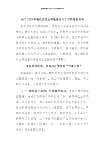 【七哥公文】2025年:【七哥公文】关于2025年镇机关党支部强基固本工作的经验材料+更多免费公文+VX:QiGeGongWen2024+更多免费公文+VX:QiGeGongWen2024