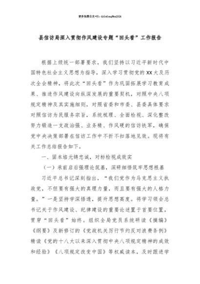 【七哥公文】2025年:【七哥公文】县信访局深入贯彻作风建设专题“回头看”工作报告+更多免费公文+VX:QiGeGongWen2024+更多免费公文+VX:QiGeGongWen2024